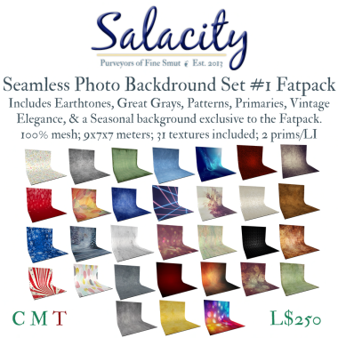 A set of seamless backdrops that each contain 4 different textures! They have a lovely, subtle curve to them, making them much like a seamless painted muslin background for RL photography. The set includes 6 different individual backdrops. A fatpack is also available.