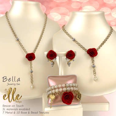 The Bella Full Set contains necklace, earrings and bracelet. Included is a colour change hud to customize as you like for the metals and beads.