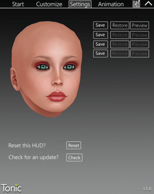 First of all I want to say that this mesh head is especially for those of you who still uses their system head and haven’t found their way into the mesh world. Tonic started to give you a really easy to use hud for the head. At least also easy to use as their both mesh bodies – you should have a look to if you don’t have one or want another one.