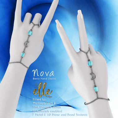 My hand chains/bracelets are made by Elle Boutique. The Nova Bracelets are availaable at 4Mesh. The stones, beads and moon make a nice line down to the index finger where the chain encircles it. There’s left and right versions fitted for the Maitreya and SLink bento hands and the HUD’s loaded with 7 metals and 10 each stones and beads. It’s also SL materials enabled