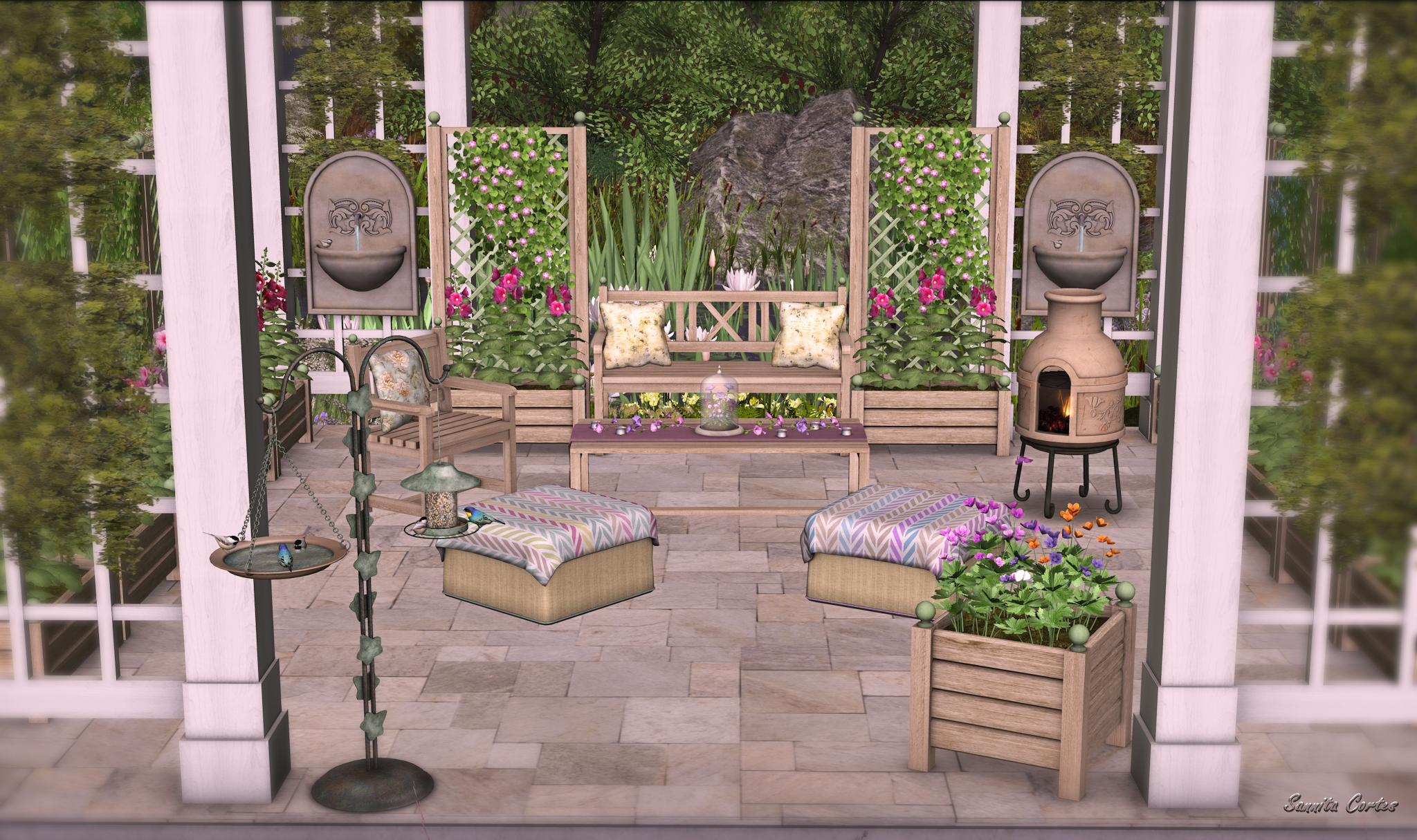 - A a variety of garden decor with pretty Hollyhock trellis planters, Geranium planter boxes, hanging flowers, wall fountain, bird feeder stand and clay oven .