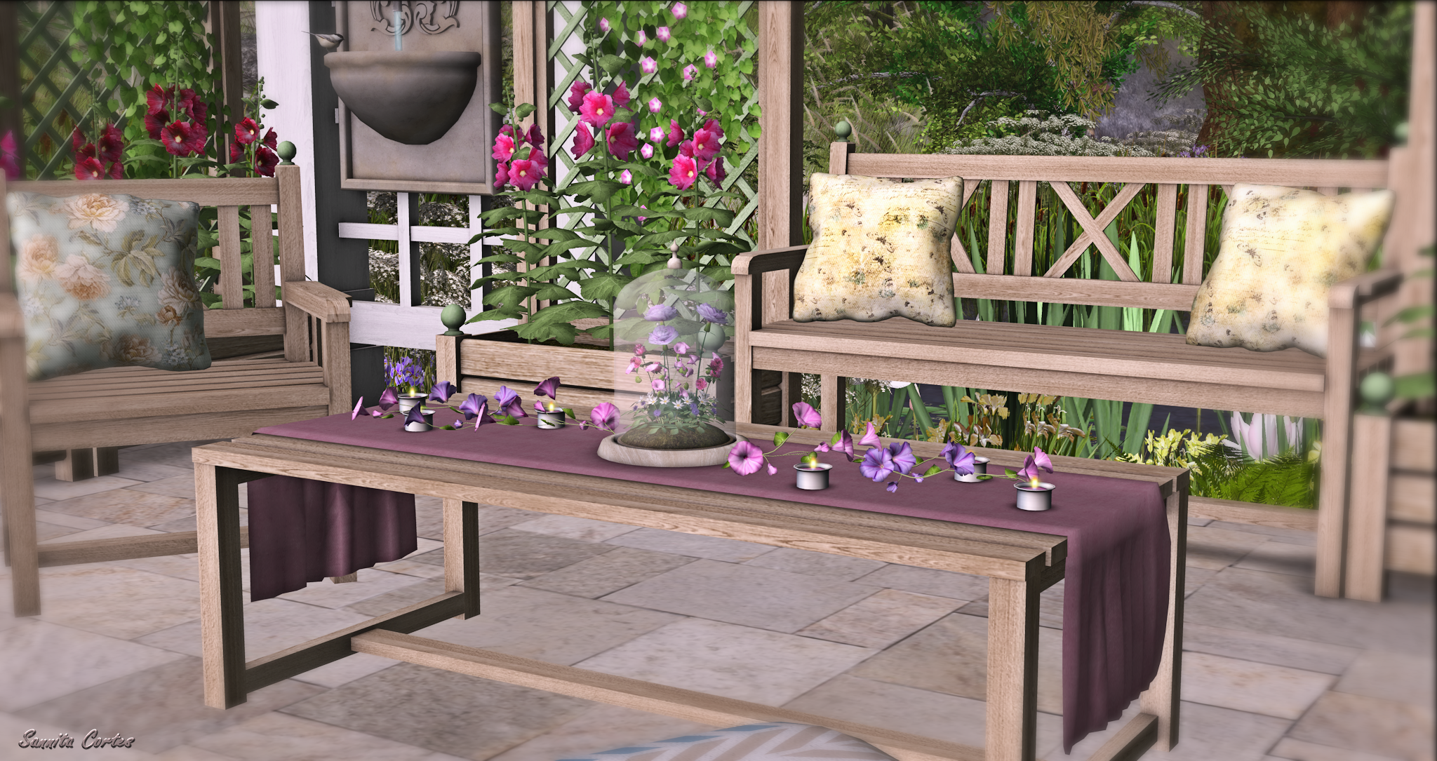 - The patio table would be one of the main centre pieces as it has a pretty floral designed cloche, tealight candle details, and morning glory vines. It’s the most ornate piece of the set.
