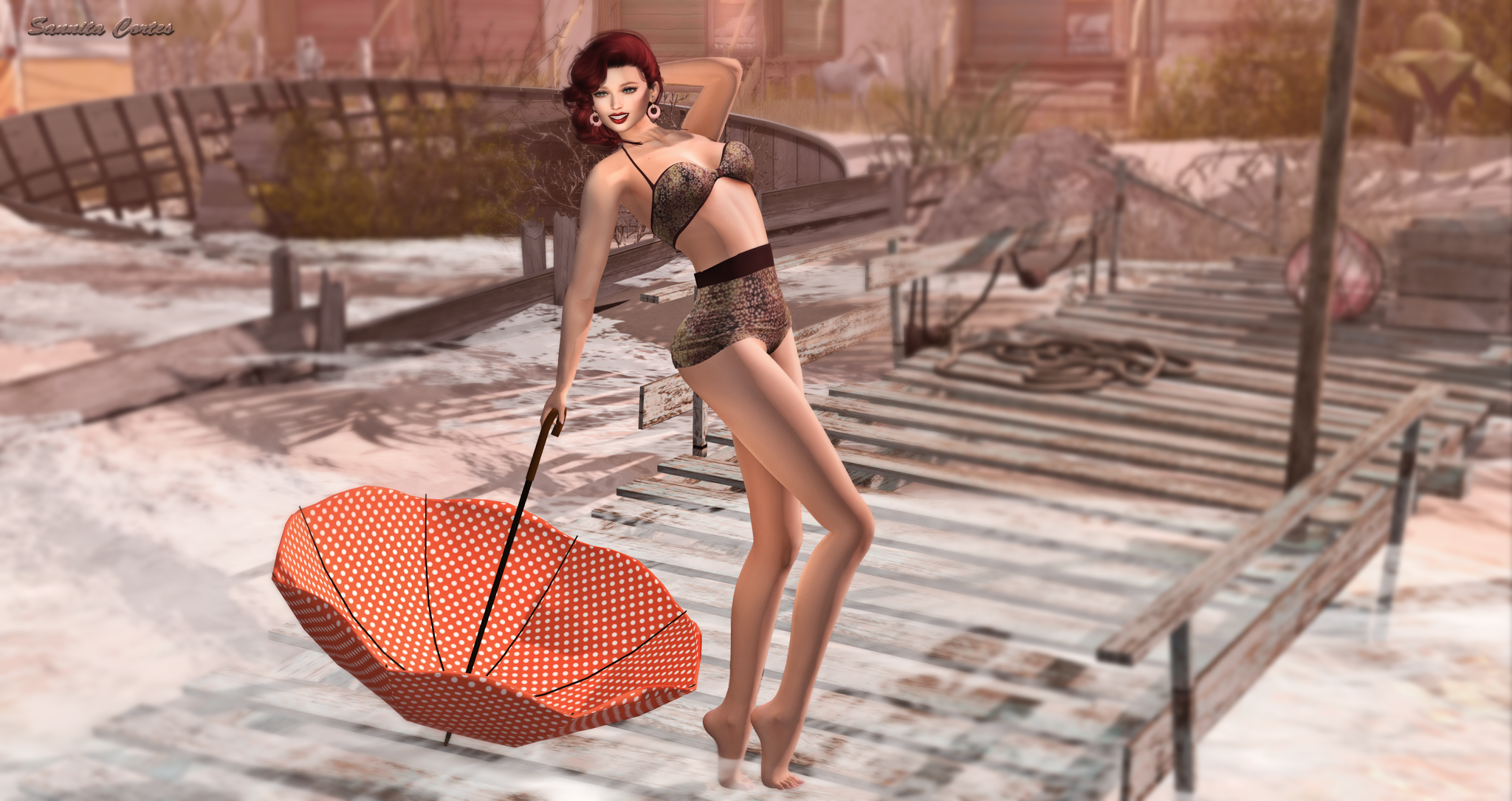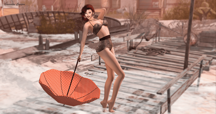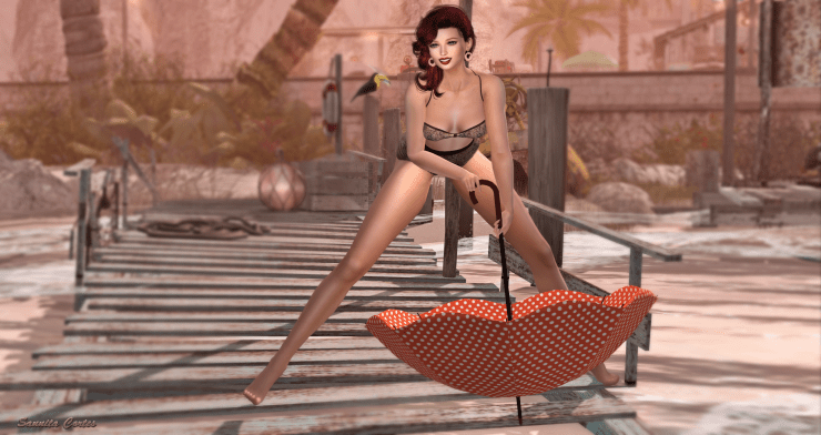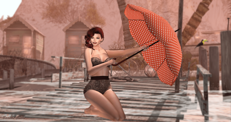 Each pose comes with a wearable umbrella with 6 different polkadot colours. Add the umbrella to activate the pose. The Vintage Fair runs from June 8 – 24, 2018. Image Essentials is situated on the South Sim.