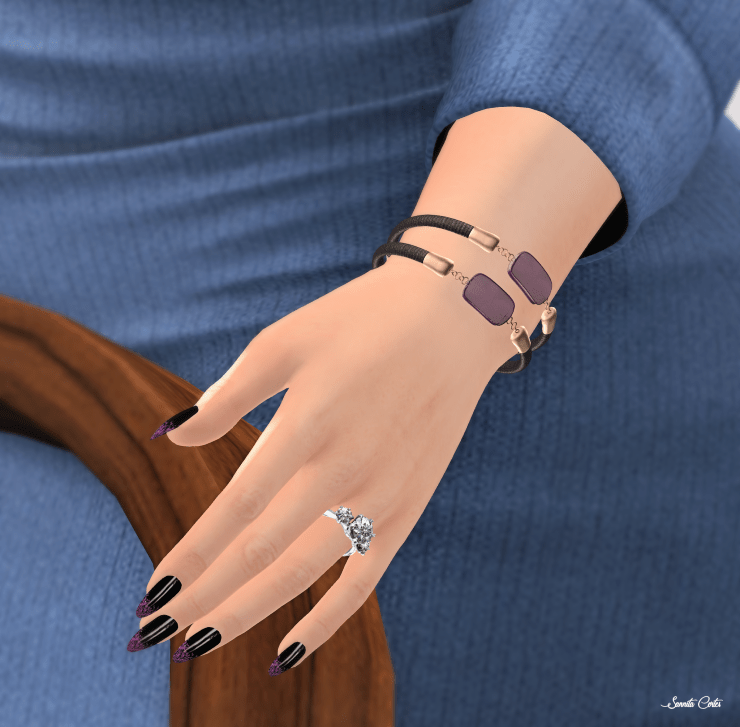 My bracelets are the group gift January by Petit Chat. These bracelets coming for left and right hand. I copied them and edited them on my wrists.