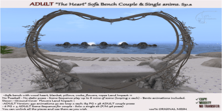 Sofa bench with wood heart, blanket, pillows, rocks, flowers, ropes (Land Impact: 11)