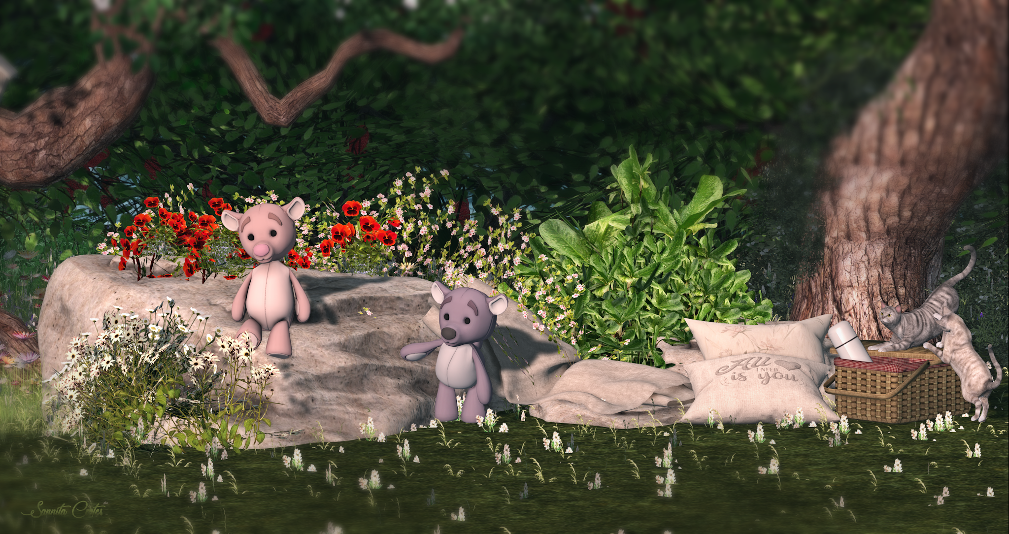 A scene with pillows, blanket, rocks, flowers, plants and teddy bears