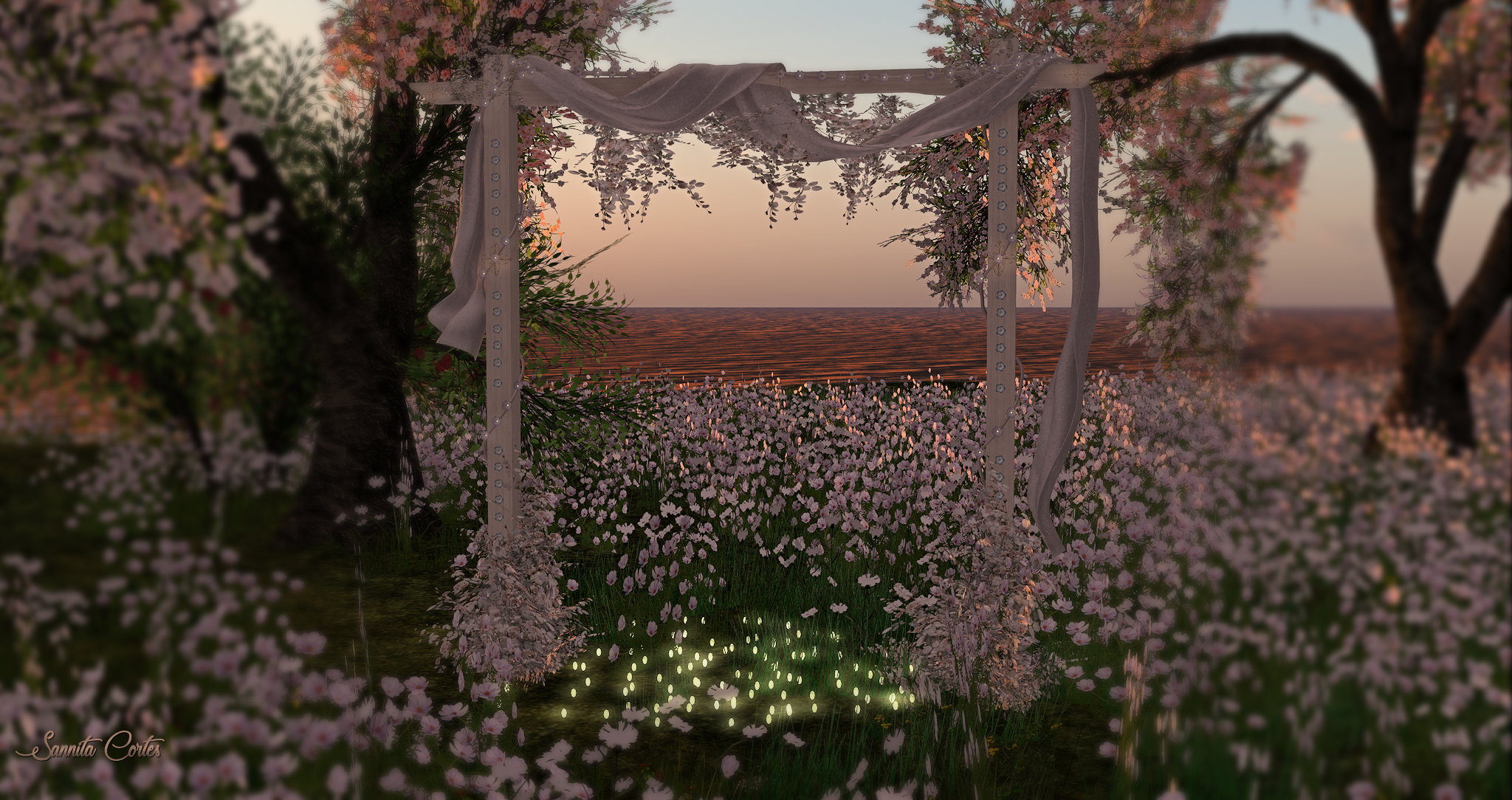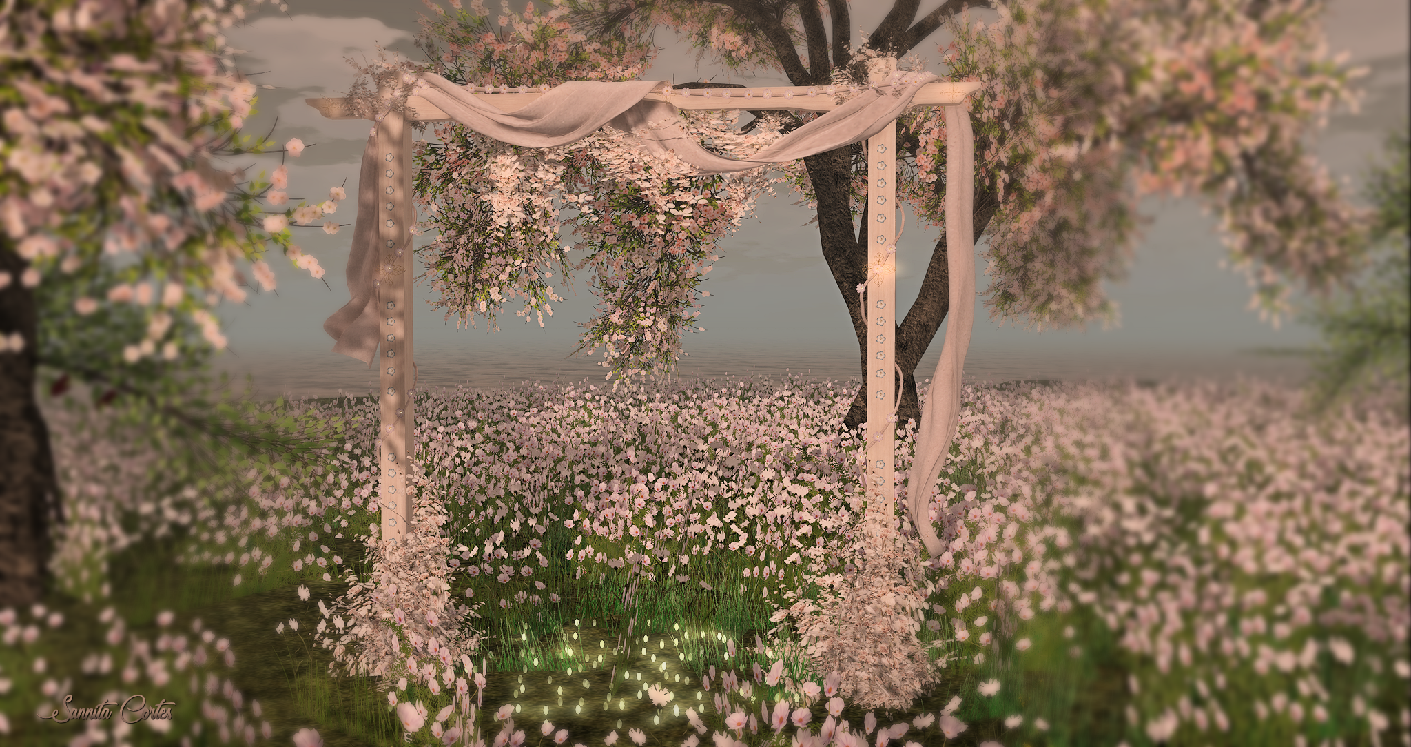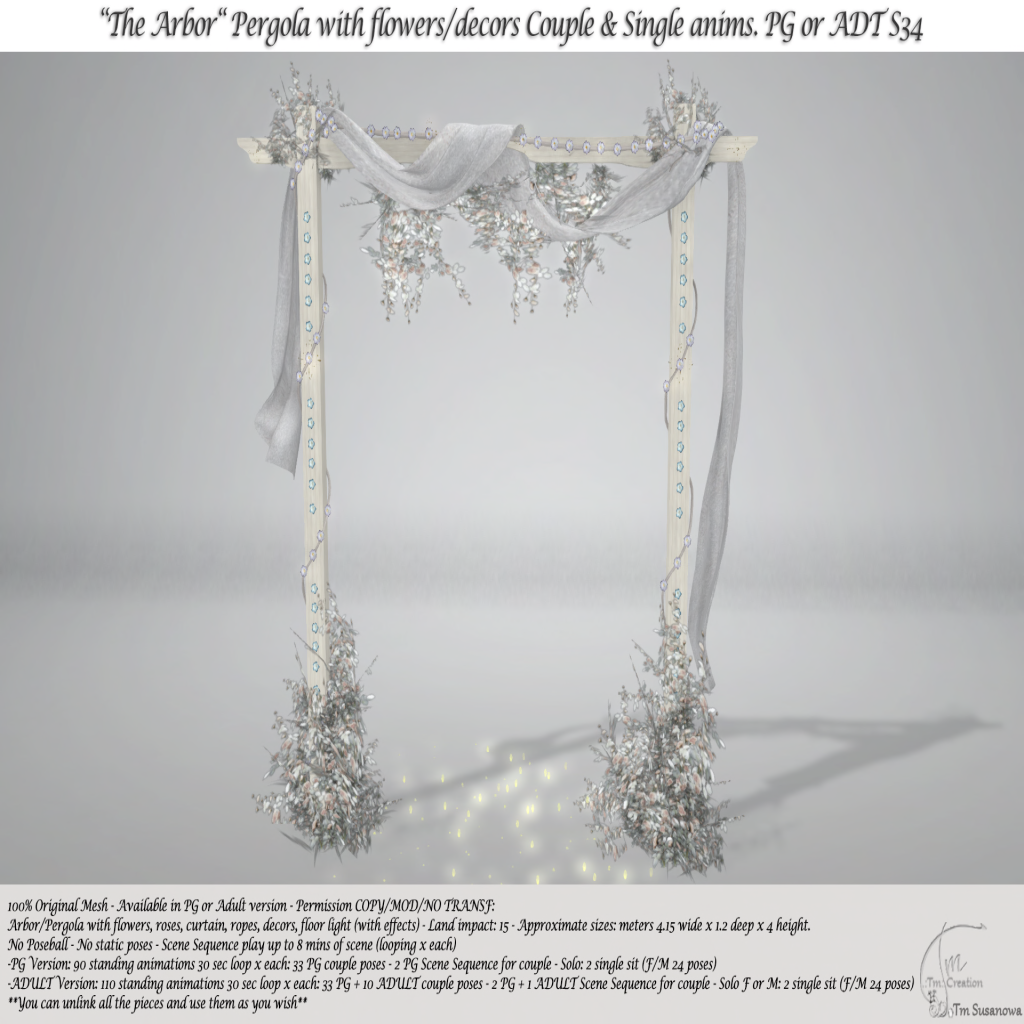 Arbor/Pergola with flowers, roses, curtain, ropes, decors, floor light (with effects)