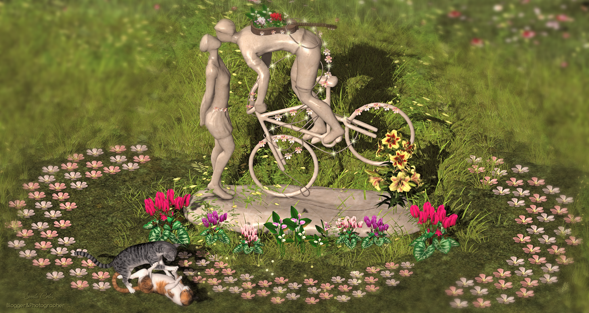 Scene with kiss statue, guitar, flowers, bushes, wildgrass, rope, ground flowers, floor lights with effects.