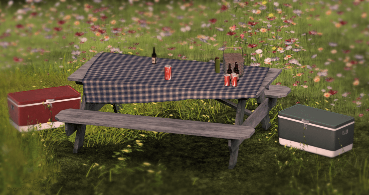 Set of accessories to make your picnic experience fuller! Tablecloth, picnic basket, drinks, condiments and two coolers (one with simple sitting animations and the other with a drink-giver) are included.