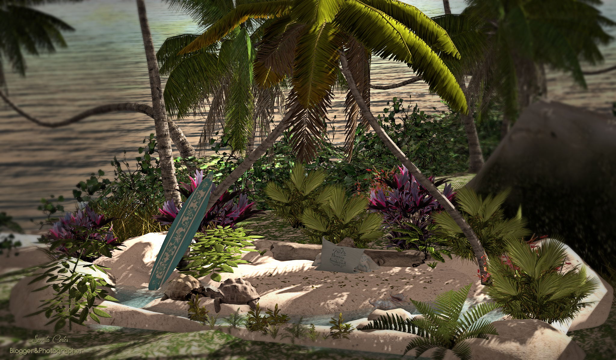 The sand isle is walkable with: water (with motion),palm trees, rocks, plants, flowers, seashells, trunk, surf board, turtles, pillows & ground leaves.