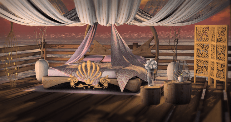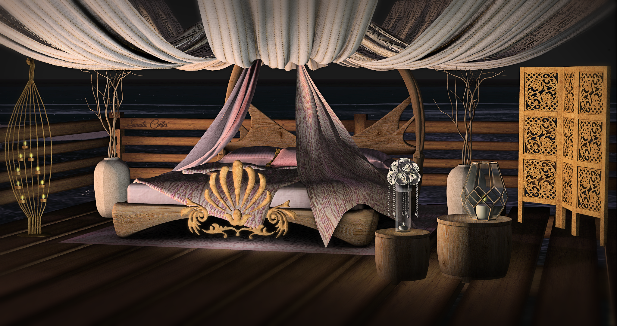 I am showing you here this wonderful bedroom set by EVHAH for this round of Swank Event. I renewed my home for it. Always thought about sleeping outside at our beach home ! Now I redecorated and I can follow this dream !