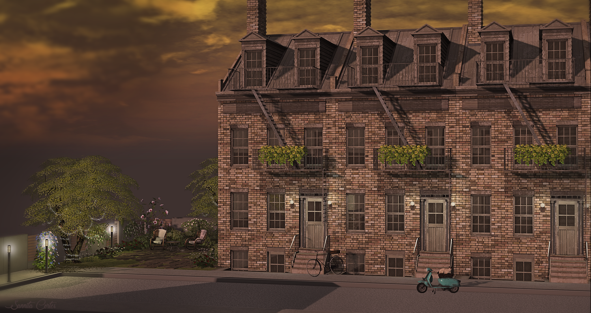 I also took some decoration of a backdrop scene by DiMi’s creations to decorate the houses and street. Again here too, showing you the complete scene in one of the ext posts. Bike, little lamps at the end street, vespa with cat, all plants at the house.