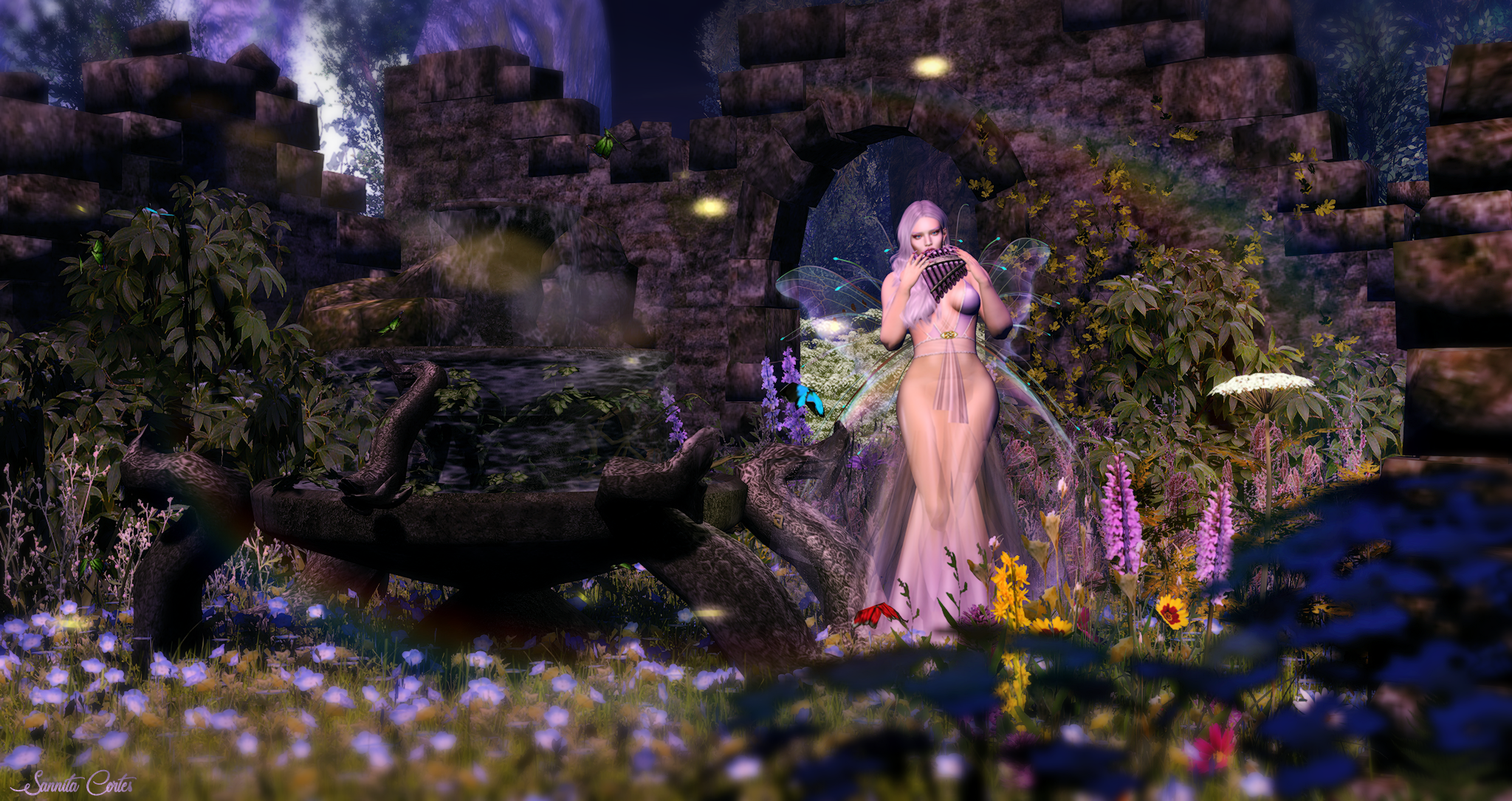 Old mossy ruins with overgrown fountain, wild flowers, flying butterflies and mystical fireflies