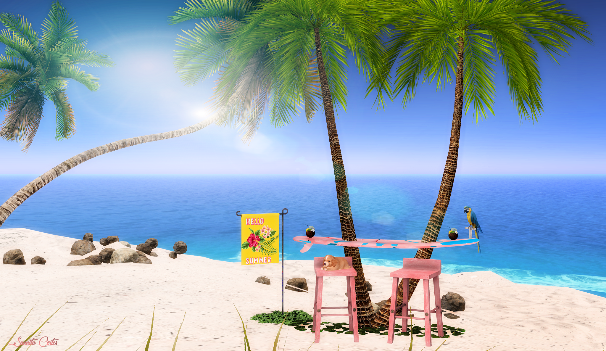 A surfboard between 2 palm trees and 2 seats in front for you. And additional a parrot watching you 🙂