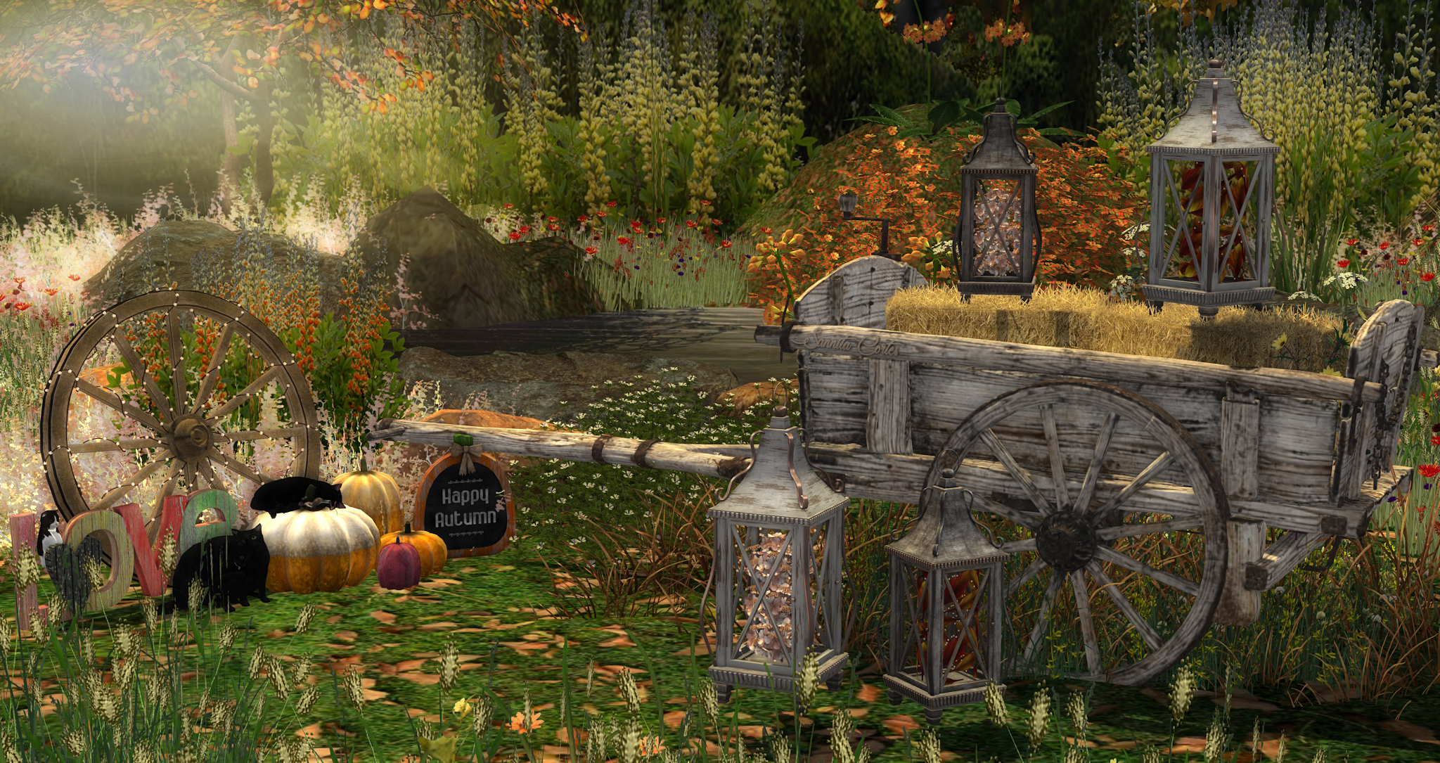 Includes ponds dotted around the landscape, surrounded by moving autumn trees and moving grasses.