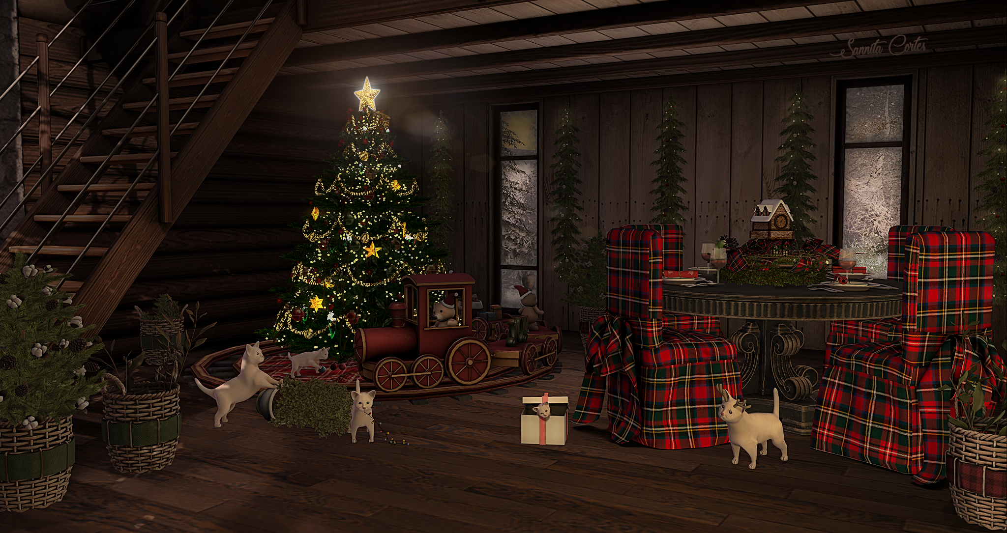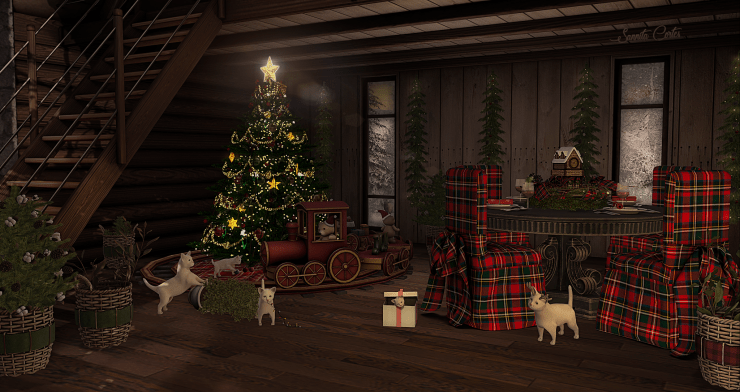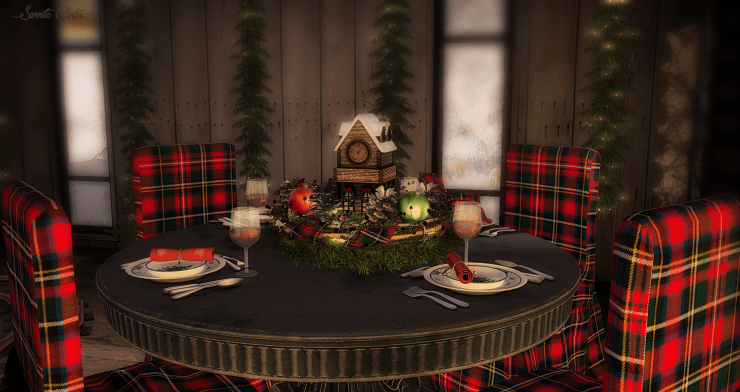 Table with 4 chairs. Chairs with red plaid and loaded with Dining animations with