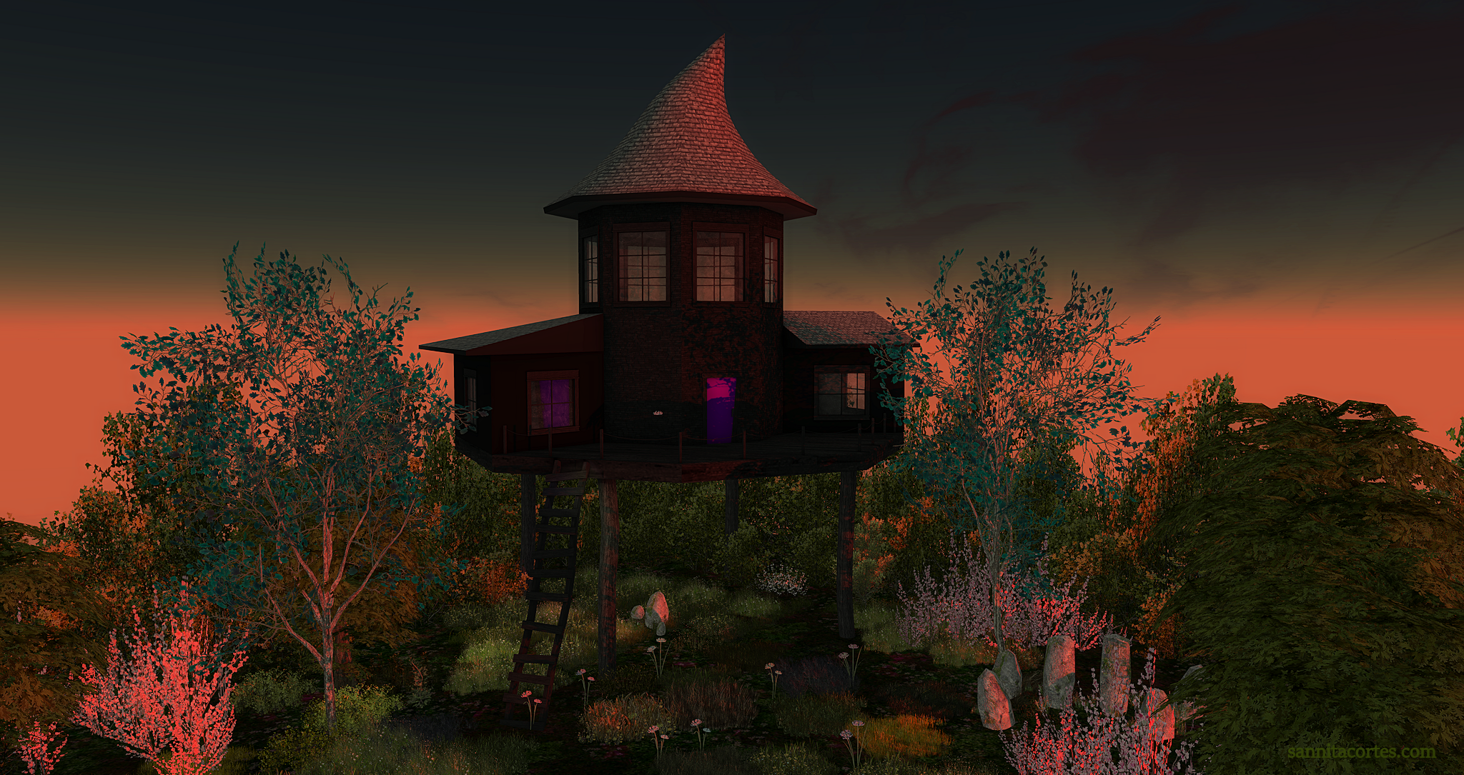The Burton House is a whimsical home on crooked stilts inspired by the amazing works of Tim Burton. There are 3 small rooms on the main level with oddly shaped doors and two back patios for two of the rooms. Up the wonky staircase you will find a larger room in the tower surrounded by windows. Approximately 20×20 footprint, 98 LI