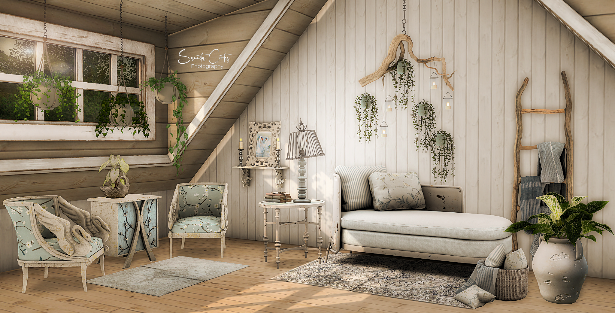 includes: daybed, blanket&pillow basket, blanket ladder, end table with lamp and book decor, hanging plants&candles, potted plant, rug.