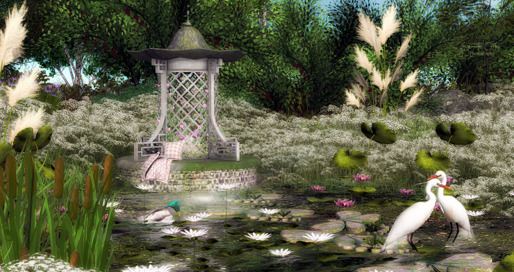 includes leaves floating, tall leaves, white flowers arrangements, mossy rock, moss group 1&2, moss group floating animated, fireflies animated and sparkling.