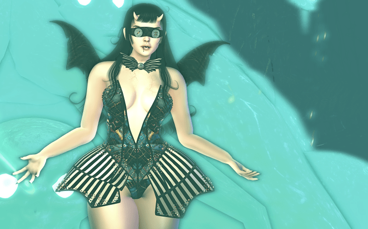 includes: dress, eye mask, heels (not shown here), panties, bow tie, wings.